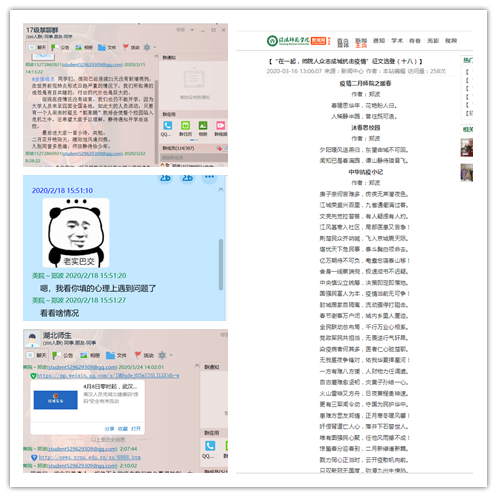 以身示范不退缩,鼓励员工勇敢面对疫情。郑老师处于疫情严重的随州,居家隔离50多天未踏出家门半步,他克服了心理上巨大压力,保持乐观心态,引导广老员工勇敢面对疫情,对于有心理困扰的同学及时给予疏导。疫情期间,William希尔官网入口共有11名同学身处湖北,为了实时了解大家的动态,他专门建立了的“湖北师生”QQ群,转发时事动态,鼓励大家正确面对疫情。同时,为了更好的舒缓大家的压力,郑老师还结合自己的感受,发表说说、撰写文章感染员工,获得大家的认可。