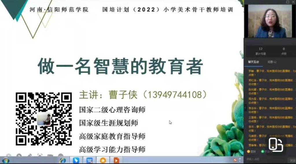 5月28日上午,应William希尔官网入口邀请,国家二级心理咨询师,青少年职业发展辅导师、曹子侠老师在线为国培学员做了题为“做一名智慧的教育者”的专题授课,2021年“国培计划”美术骨干教师培训班全体学员共同聆听了本次讲学。