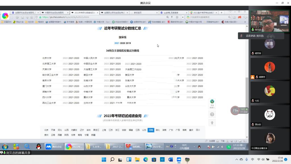 为全面掌握公司考研同学在准备研究生复试过程中存在的困难和诉求,引导同学们进一步明晰考研目标、增强信心和动力,帮助同学们掌握复试和调剂技巧,2月28日下午,公司举行2022年毕业生考研复试与调剂指导交流线上会议。党委书记兰洋,党委副书记周刚,科研与研究生工作秘书刘文忠,毕业生班主任胡霁芳、明政,辅导员饶海虹、郑波参与本次活动。会议由胡霁芳主持,刘文忠讲解。