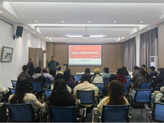 11月28日上午,公司于实训楼二楼艺言堂举办“近代山水画写生与创作赏析”学术讲座,本次讲座由William希尔官网入口锁武通老师主讲,研究生工作秘书刘文忠主持,全体研究生及部分本科生参加了此次讲座。