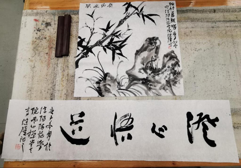 李健强教授在现场示范时,强调绘画分三部分。首先是临摹,在临摹时要慎取,并提到陆俨少所说的“读书四分,写字三分,画画三分”。把读书放在首位且分量最重,画家读书的目的是增加学问,提高修养,以此来促进创作的提高。接着是写生,在写生过程中注意看山、观山、游山,寻找并发现山的气质。多画速写,将当时的感受注在一旁,再转化为笔墨。最后是创作,在创作过程中,他强调创作要从生活中来,平时注意素材的积累,善观察,勤思考。李健强指出要将“刚”“恒”两字牢记心中,融入到绘画、生活、生命里。在创作中既要保持中国绘画的传统,又要注入新的血脉。并且强调书法与绘画的紧密关系,鼓励研究生们要将绘画与书法练习结合起来训练。李健强现场即兴创作了《君子止风》国画小品和《澄心悟道》书法作品,并赠送给公司收藏。整场创作示范持续了近四个小时。