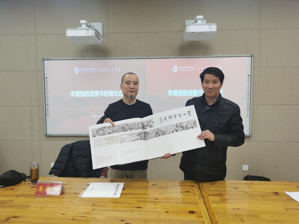 此外,李健强还将自己出版的《寄心闲远--李健强书画集》《李健强唐宋诗写意册》专著赠送给公司收藏,邹东升作为代表接受了赠书,并合影留念。