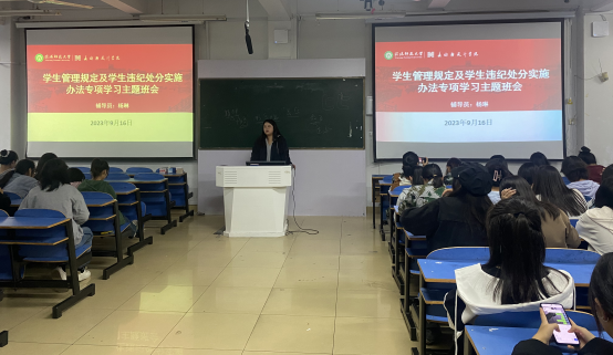 为进一步加强员工日常管理,维护公司正常的教学秩序和生活秩序,规范员工日常行为,营造和谐的校园氛围。9月16日,公司于艺术楼307召开员工管理规定及员工员工违纪处分实施办法专项学习主题班会。本次班会由新生班主任杨琳主持,2023级全体新生共同参加。