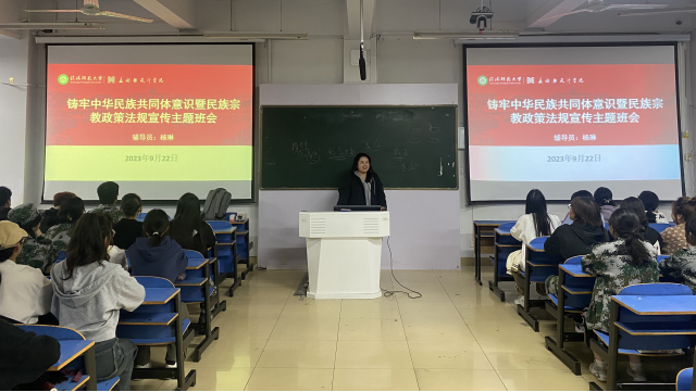 杨琳从“什么是铸牢中华民族共同体意识?”、“为什么铸牢中华民族共同体意识”、“怎样铸牢中华民族共同体意识?”三个问题出发,讲述了在中国共产党领导下,中华民族儿女情同手足、披荆斩棘建立新中国的艰难历程,讲述了各民族守望相助、共同奋斗、团结稳定、繁荣发展的大好局面。随后,杨琳带领大家共同学习《老员工中国特色社会主义民族宗教理论知识手册》,重点学习了习近平总书记关于民族宗教工作重要论述摘编部分。她强调,同学们在校期间要主动传播科学文化知识,禁止任何形式的宗教活动。