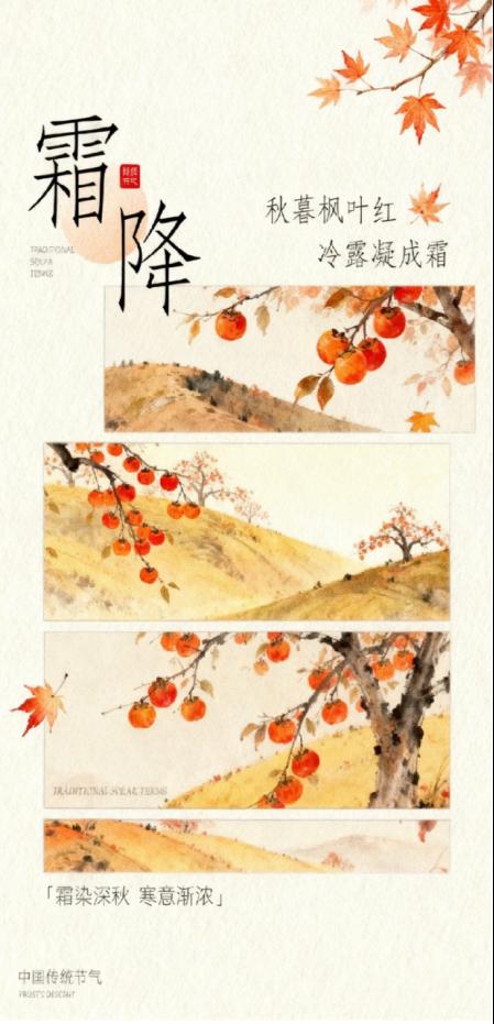 活动中,同学们紧扣“霜落秋深”主题,以设计为媒诠释季节意韵:或用渐变色彩勾勒秋叶凝霜的静美,或以抽象线条捕捉寒雾笼罩的校园景致,更有作品融入传统节气文化元素,将霜降时节的清冷与诗意转化为视觉语言。