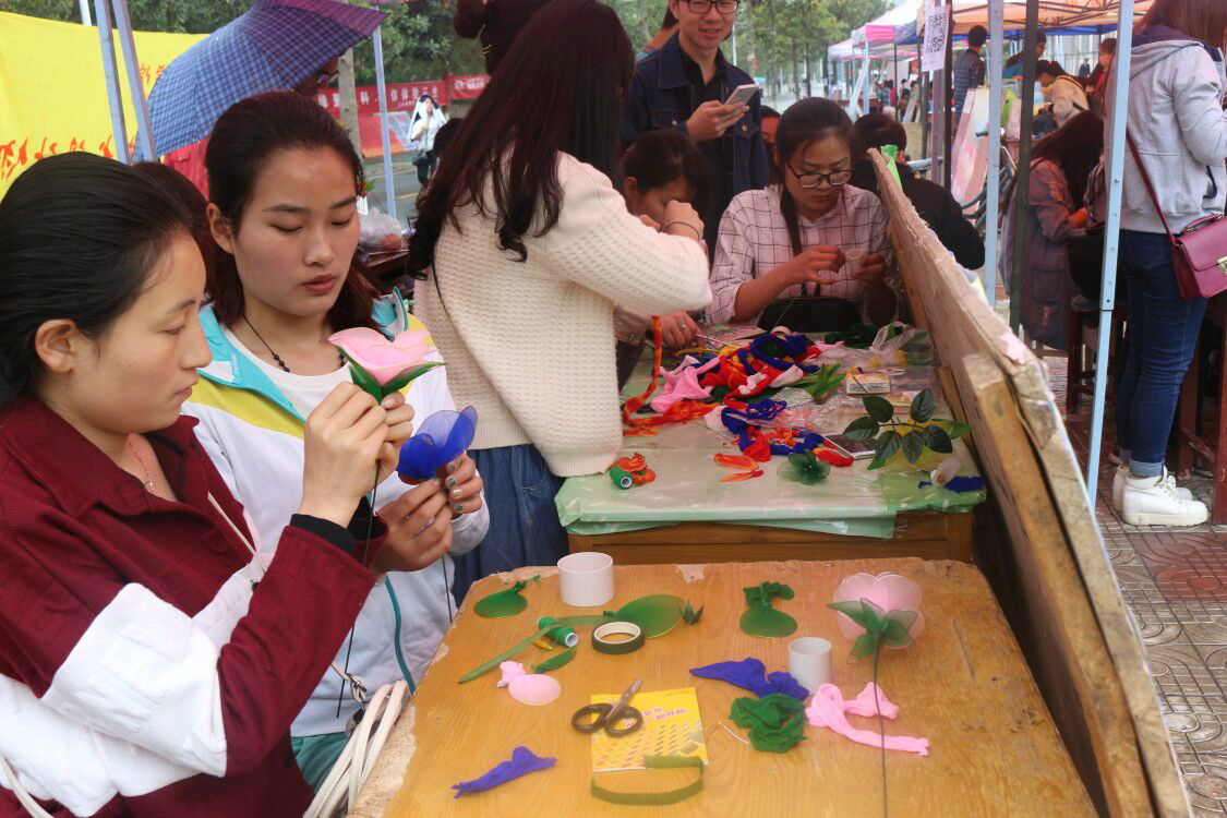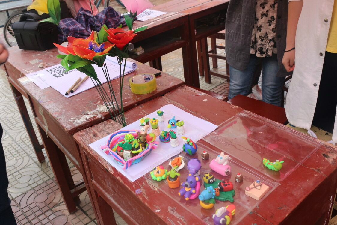 参加活动的同学,根据自己的需要挑选各类材料。随后,现场艺术设计协会有专人指导参赛者制作丝网花,或是跟着书上的步骤,一步步地认真制作,弯折、翻直不断的重复,也有同学根据自己的想象创作,很快一朵朵色彩鲜艳、精致细腻的丝网花便制作而成了。另一边,捏彩泥的同学也在认真创作中,那些彩泥通过他们灵巧的手,变成了各种栩栩如生的动物,植物或卡通人物。虽天气持续下着细雨,但现场气氛浓烈,整个活动过程中充满了欢声笑语,活动最后,将同学们的作品进行集中展示。