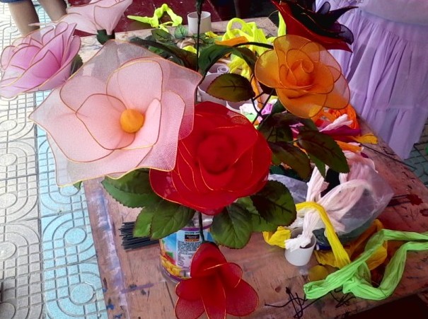 “丝袜花”又称“丝网花”,最初是人们将破损的弃之可惜又留之无用的丝袜,经巧妙构思,配以五彩铁丝纯手工制作出来的插花,其花色彩艳丽,造形丰富,并可做成胸花、发夹、工艺品等。