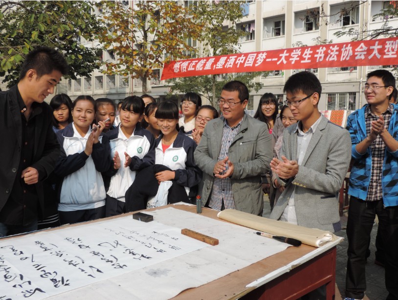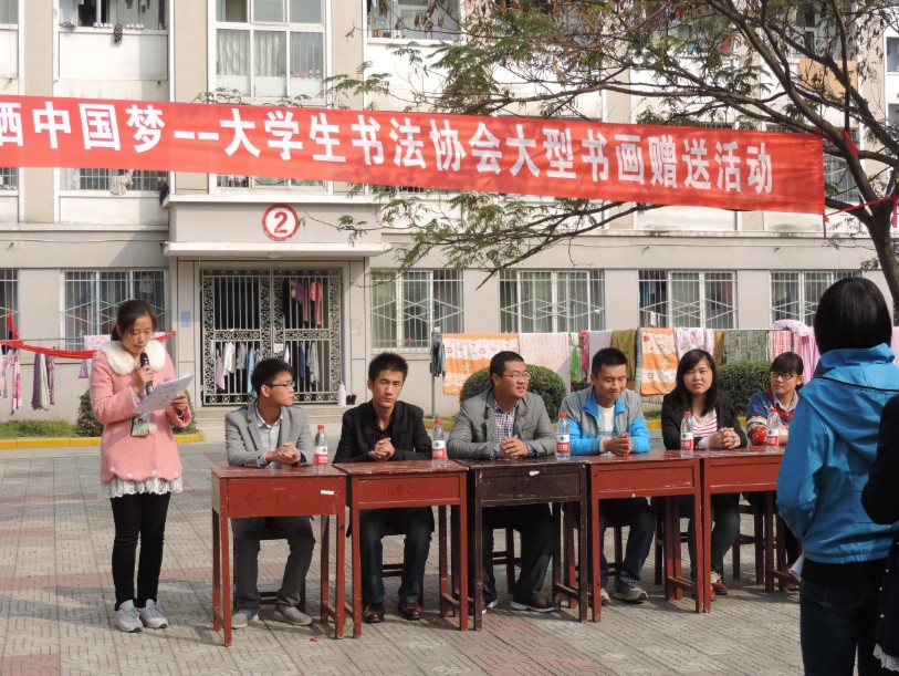 开幕式上,书法协会会长赵军帅首先代表主办单位致词,他指出本次活动与校公寓办联合举办,希望能为提高公司员工的艺术文化修养做出贡献,并预祝活动圆满成功。随后,由主持人对到场老师和特邀嘉宾做出了介绍,到场嘉宾现场挥毫泼墨,书画赠送活动正式开始。同学们积极踊跃的拿着宣纸请嘉宾们写下寄语,用以警示和勉励自己,所题之字,有的刚劲有力,有的清新自然,有的则细腻生动,风格迥异,意义深刻,整个活动晕染在文化墨韵之中。