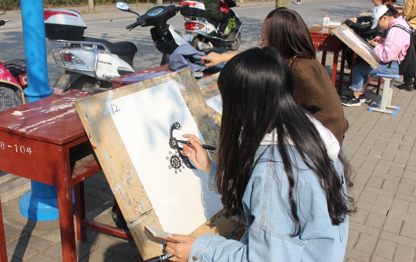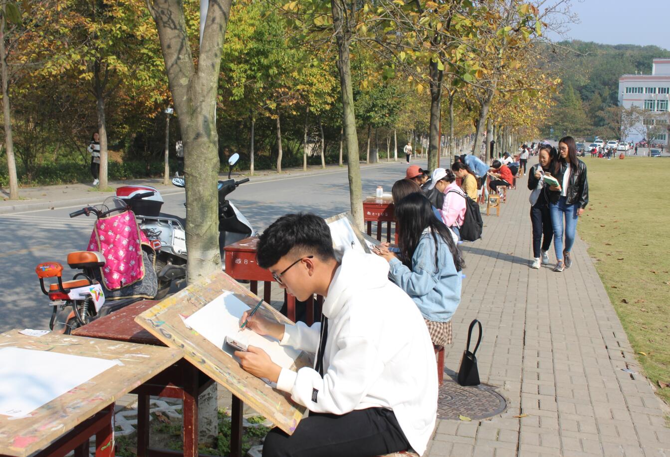 活动现场,参赛选手们各自选择景致,充分发挥创造力表现自己心中的师院。作品涵盖中国画、油画、水粉、素描等类别。选手们专心致志的创作,有的迅速挥洒晕出片片远山,有的精心勾勒描出层层屋檐,有的简单抽象绘出点点繁星。他们用画笔在画纸上尽情渲染,张扬个性,用线条展现灵感与活力。现场吸引了许多观众驻足观看,形成了一道亮丽的风景线。下午,所有参赛作品均已绘制完成,活动负责人将选手们作品收揽后挂于八餐小广场进行展示并由专业人员负责品评。