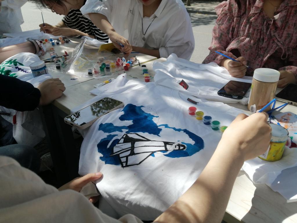 活动采用线下现场绘制,由主办方提供用具,同学们在衣服上进行着勾线,上色等操作,活动现场大家神情专注,认真绘画。经过参赛者们认真的绘制,一副副富有想象力的图案呈现在衣服上,有卡通图案、文字图案等等,每一件衣服上都增添了无穷的艺术魅力。现场气氛活跃,吸引大批师生前来参观,公司团委老师郑波也到现场参观指导,并对活动作品给予了充分肯定。活动结束后作品在八餐广场进行了集中展览,并邀请了专业人员进行打分评选。