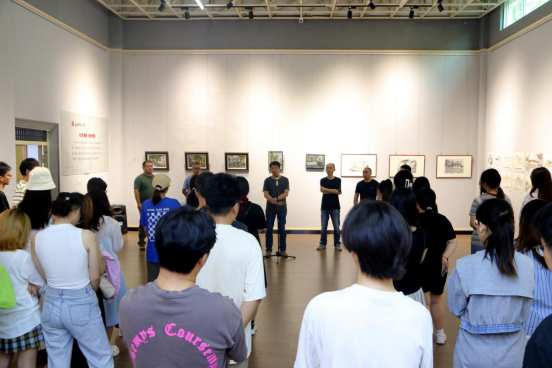 开幕式上,邹东升充分肯定了本次考察写生课程教学活动的优秀成果,赞扬了同学们爱学习、肯吃苦、能奋斗的学习态度,鼓励同学们要继续保持对艺术的热爱,坚持创作、用心创作,将公司本科生应有的艺术创作水平予以展现。同时,他还对2021级毕业创作做了安排,要求教师员工从大四上学期着手准备,留足时间创作,争取创作了一批优秀的高质量毕业作品。张江波对本次写生考察的宗旨进行了说明,对展览的后续工作进行了安排。开幕式结束后,带队教师与同学们现场交流座谈。同学们踊跃发言分享了自己考察写生的收获。带队教师则从专业创作角度和同学们做了交流点评,举例说明了各种细节需要理解掌握的绘画技巧,分析了同学们创作过程中的得与失,鼓励同学们积极创作,积极参加比赛。