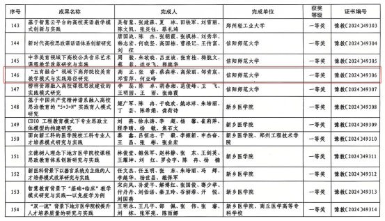 近日,河南省教育厅了发布《关于公布2024年度河南省高等公司产品成果奖获奖项目名单的通知》(教高〔2024〕363号),公司教师高正主持“‘五育融合’视域下的高师院校美育教学模式与实践路径研究”荣获2024 年度河南省本科高等公司产品成果奖一等奖。