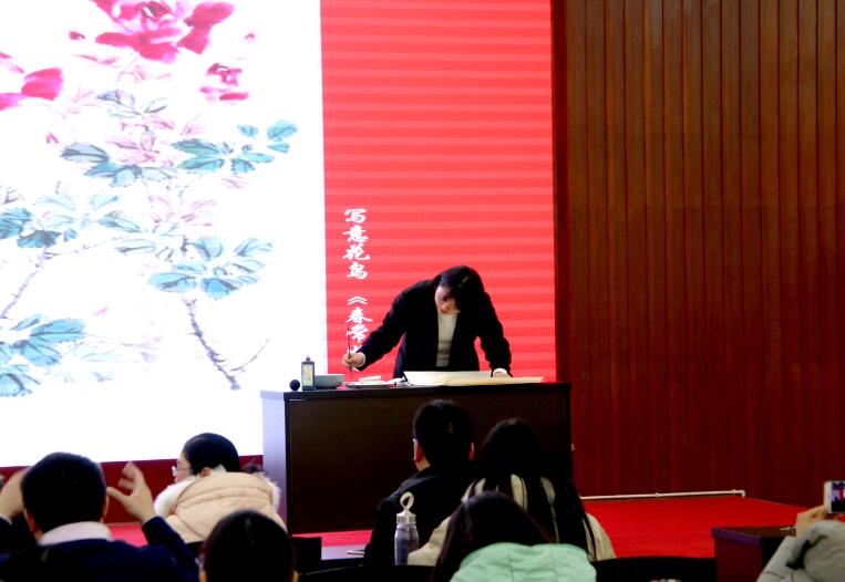 公司艺术硕士专业研究生路萍同学在闭幕式的汇报展示环节中对中国传统绘画进行了详细的讲解,并在五分钟画现场完成一幅惟妙惟肖的写意花鸟画,赢得了现场人员的热烈掌声。