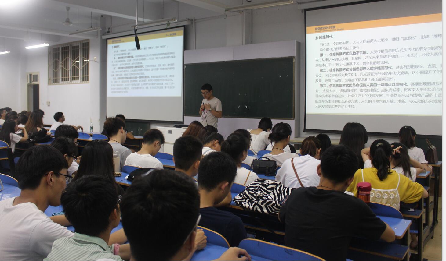 讲座围绕视觉传达设计专业整体概况、学习规划与学习方法两大部分展开。刘文忠首先为同学们介绍了时代背景,我们正处在一个网络化、信息化、图像化和智能化时代,当今社会瞬息万变,作为设计者要提高看、思、做的视觉能力的培养。随后,刘文忠讲解了视觉传达设计的相关概念并根据设计作品详细阐述了设计的广告、导向、包装、UI等应用领域,他表示视觉素养是现代人类必备的人文素质。最后,他重点强调了学习规划与学习方法,他指出应作详细的计划和规划,并通过自己的教学经验,提出中肯的建议,在场学子纷纷表示受益匪浅。