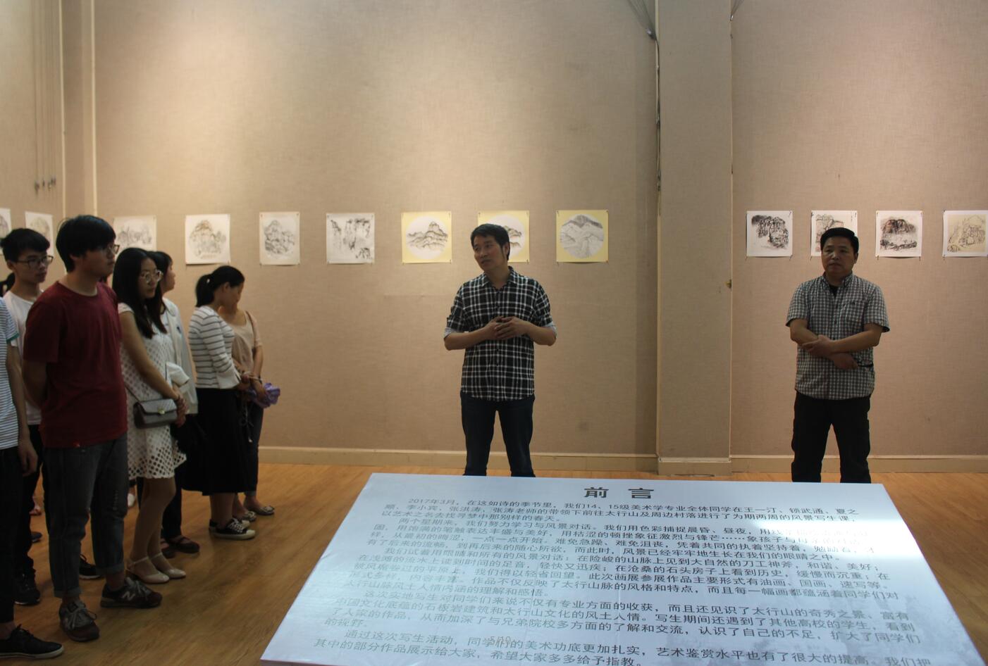 邹东升致开幕词。他首先向参展员工表示了热烈的祝贺,对同学们外出写生期间,不畏艰辛,坚持创作且不断创新的精神的表示了赞扬,并寄语同学们要坚持绘画,大胆创作,不断提升自己的文化内涵,加深自己的艺术底蕴。随后,张伟作发言,他指出本次参展作品水准较高,是公司教学成果的直观体现,是学子们扎实的技巧的体现,希望同学们可以以此为契机加强学习,增进交流,共同提高,用绘画创作丰富课余生活。开幕式结束后,全体师生在展厅内自由观展。本次展览,以“太行山”为主题,共展出由2014级、2015级美术学专业员工按教学计划到太行山一带采风创作的精心之作百余幅。参展作品形式多样,包括国画、油画、速写三个板块。作品各具特色,别有风味。有的展现出太行山的静谧,有的呈现出农家小院的温馨之感,有的展现了绿浪滔天的林海、刀削斧劈的悬崖、千姿百态的山石、如练似银的瀑布、碧波荡漾的深潭。展出的作品以写实的手法,将太行山地区雄浑壮丽的自然风光,描绘得淋漓尽致,令人如临其境,充分展现了公司学子扎实的专业水平和极具创新的思维能力。 本次展览的举办,不仅考察了公司学子将理论学习与创作实践结合的能力,也展现了同学们各自独特的艺术风格,为观展师生呈现了一场艺术的饕餮盛宴。同时激发了学子们的创作兴趣,对于鼓励公司学子走进自然,感受生活,积极进行创作,提高自身的艺术修养和综合素质具有重要意义。