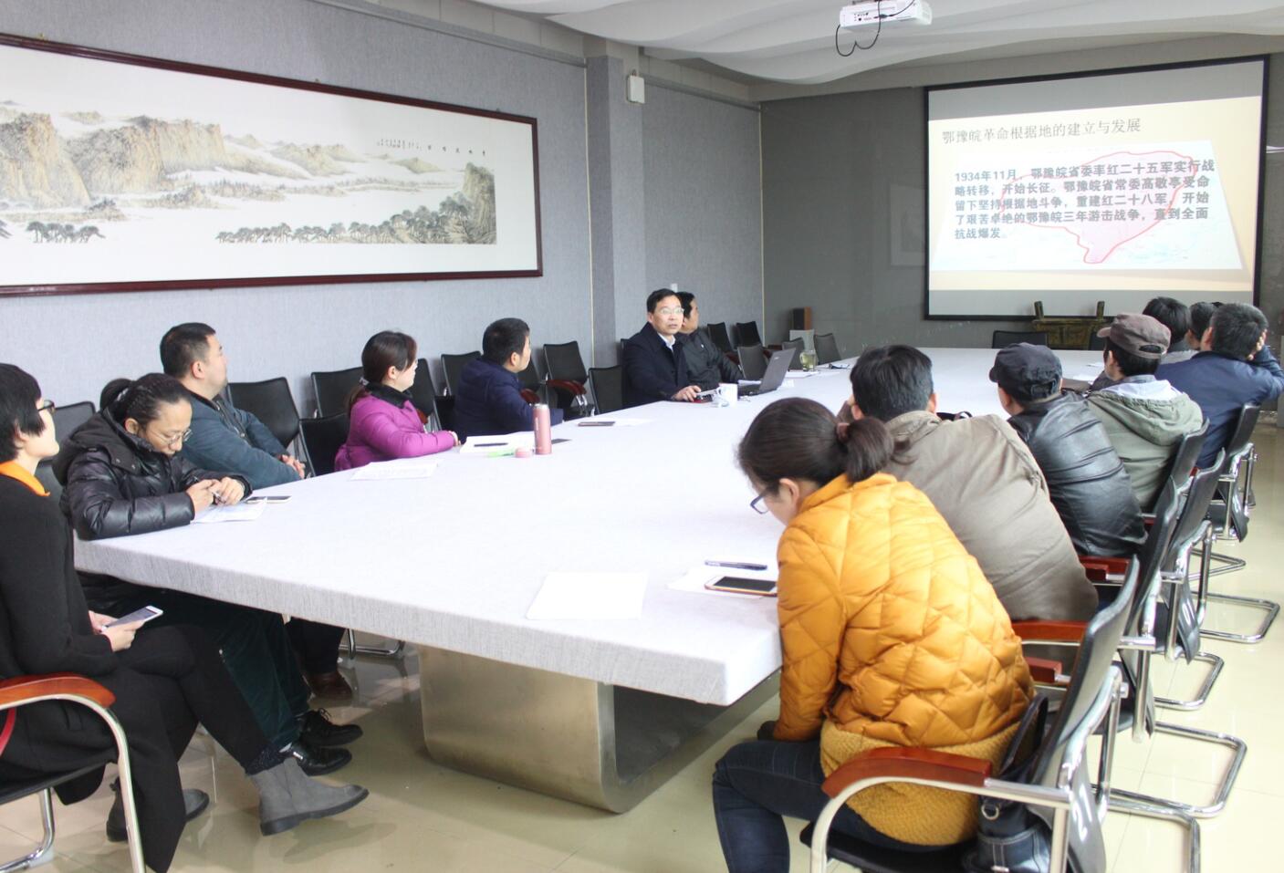 报告会围绕大别山红色历史概貌、大别山红色历史贡献与大别山精神、大别山红色历史创作题材与选题视角三部分展开。会议伊始,田青刚教授为在座教师简单介绍了大别山区域概貌,从"红色"的视角带领在座教师了解大别山。他讲到就大别山红色精神形成而言,三大武装起义及其成果促进了鄂豫皖革命根据地的建立与发展,大别山精神即中国共产党领导大别山革命斗争时期所形成的以"红旗不倒"为主要特点的革命精神。田青刚教授重点强调了基于大别山红色历史的美术创作题材与选题视角问题,可从宣传红色统一战线政策的题材等方面入手,积极创作出宣传大别山红色文化、反映社会经济文化事业发展的作品。最后,邹东升为此次报告会作出总结,希望公司教师多加思索,积极创作。