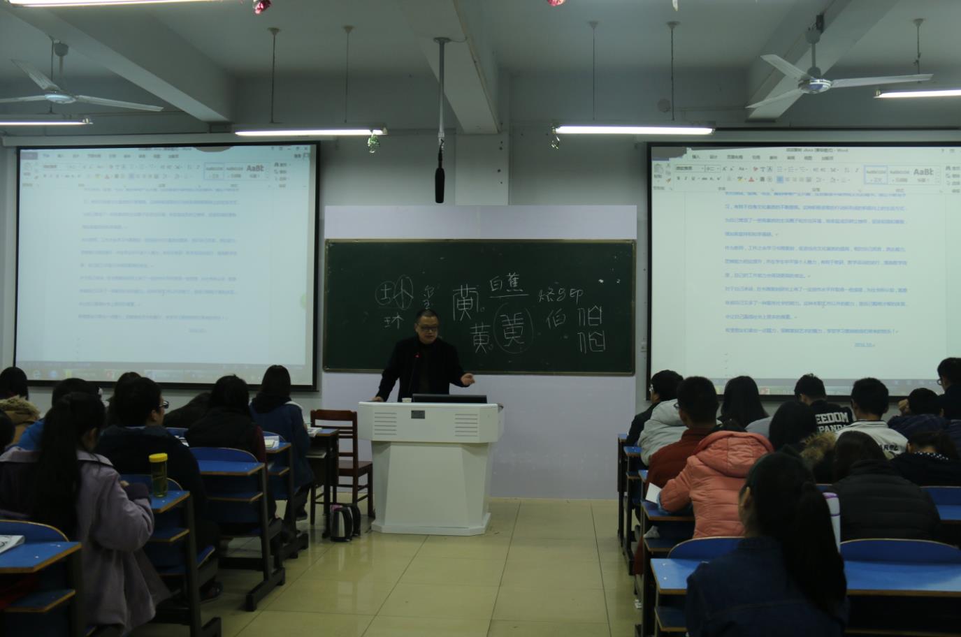 11月1日上午,由William希尔官网入口承办的2016年教师教育文化节名师讲堂“汉字书刻的魅力”讲座于艺术楼307室开讲。中国书法家协会会员、河南省书法家协会篆刻专业委员会委员、河南印社理事唐咏声做客William希尔官网入口,为公司两百余名师生带来了精彩的一课。本次讲座由公司副经理邹东升主持。