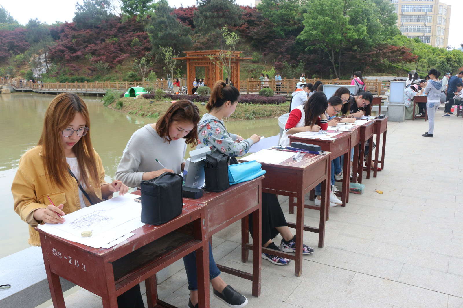 活动伊始,参赛者根据已分配好的位置入座。大赛作品大致分为四个类型,即绘画、书法、篆刻、手工制作。绘画又包括素描、水粉、油画、山水、版画等形式。各位参赛者充分发挥自己对校园的想象,将自己最美好的记忆表达于画纸之上,笔墨之中,篆刻之下。另一边的舞蹈更是把活动现场气氛渲染的分外热烈,让参赛者充满激情。参赛者用不同的手法描画着同样的心情,表达着同样的情思,以独特的视角记录校园美景和师生风采。现场的作品或温婉而曰,或豪放不羁,或唯美秀丽,或奇思妙想,皆把师院美景表达的淋漓尽致。