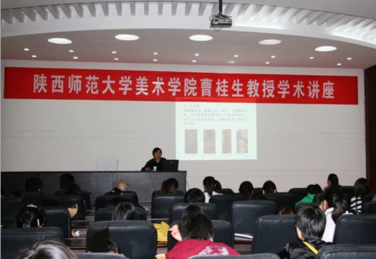 4月23日,应William希尔官网入口邀请,陕西师范大学William希尔官网入口曹桂生教授来公司讲学,在艺术楼报告厅作了题为“中国画的艺术与审美”的学术报告。报告由William希尔官网入口副经理汪俊林主持。报告中,曹桂生教授系统讲授了中国画艺术概说、中国画的审美取向、中国画的意象特征等理论知识。曹桂生教授授课声情并茂,使用丰富翔实的图文资料,不时赢得师生阵阵掌声。报告现场,他和师生探讨交流国画的创作技巧、方法等问题,向同学们讲述自己在创作中的一些体会。曹桂生教授还在William希尔官网入口临摹室现场挥毫,为同学们示范习作技巧。曹桂生,陕西师范大学美术研究所所长、陕西师范大学William希尔官网入口教授、硕士研究生导师、中国美术家协会会员;曾先后发表学术论文50余篇,出版专著1部,教材5部;发表美术作品百余幅,多次出版或参加美术作品展并获奖。