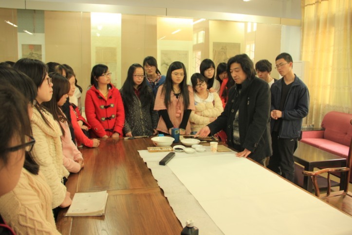 梦鸿先生首先从中国画的技巧入手为同学们讲解写意山水中用笔的基本技法有:“勾,皴,擦,点,染”五种,用墨的基本技法有:“浓、淡、干、湿、焦”五种。他还强调,好的作品一定要讲生活积累,生活的积累有两方面,一方面是社会生活、感情生活,塑造一种感情样式,加上先天的个性。另一方面是对表现对象的了解,对象的结构、生态、生活习性、情态,一定要了解,了解后才能准确地把感情表现出来。赋予荷花高洁的情操,先要了解荷花,它的生态和结构,否则成了南辕北辙。还要带着情感去看待事物,一花一叶总关情。在讲授的过程中,梦鸿先生通过自己的画笔向同学们展示一个完整的创作过程。示范课结束后,梦鸿先生还就艺术创作中的一些问题与同学们进行了交流。