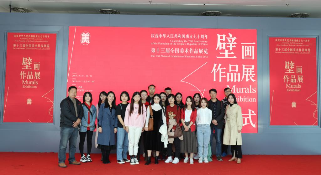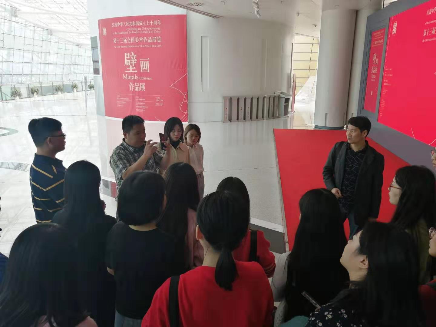今年适逢新中国成立70周年,五年一届的全国美术作品展览,是全国美术界五年来发展阶段的全面检阅与展示。壁画作品凝聚了壁画艺术家对时代的真切感受和对艺术的真挚追求。通过此次外出实践教学活动,进一步开拓了研究生的学术视野,对研究生的学术生涯规划、艺术创作方向确定具有很强的指导性。