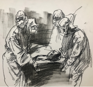 疫情最严重时,一群医护工作者勇于担当,义无反顾,奔赴抗疫核心区,为患者医治,作者看到众多媒体发布此类新闻,有感而发,便选了一些图片,以美术作品的形式记录和表现,选取医生看病厉,讨论医治方案的情形,以平行分割的形式表达主题,突出人物动态之专注。