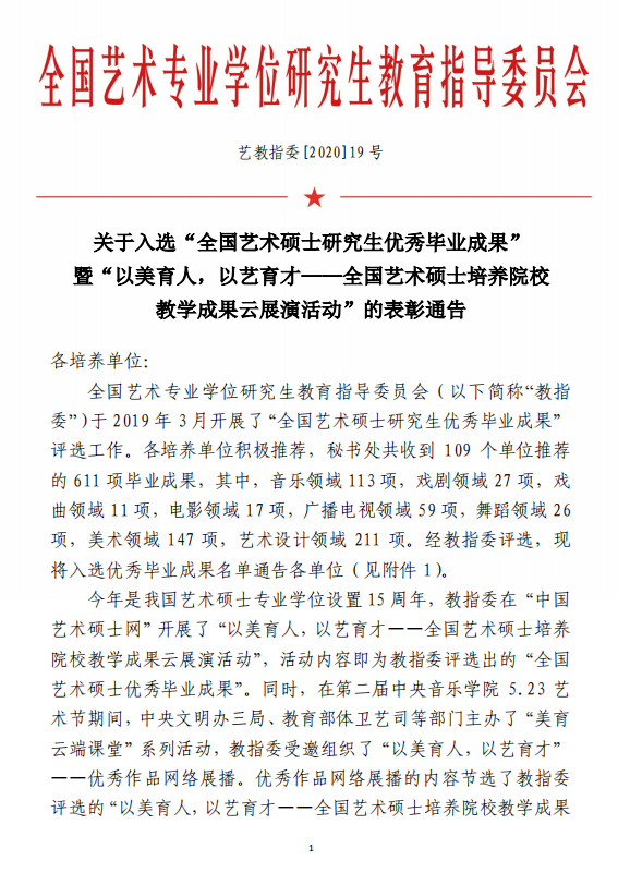 近日,全国艺术专业学位研究生教育指导委员会公布了“全国艺术硕士研究生优秀毕业成果”入选名单。公司邹东升教授、潘静副教授共同指导的2017级艺术硕士(美术)专业学位研究生苏畅同学的毕业成果(毕业论文、毕业创作)成功入选,并得到了教指委的通报褒奖。