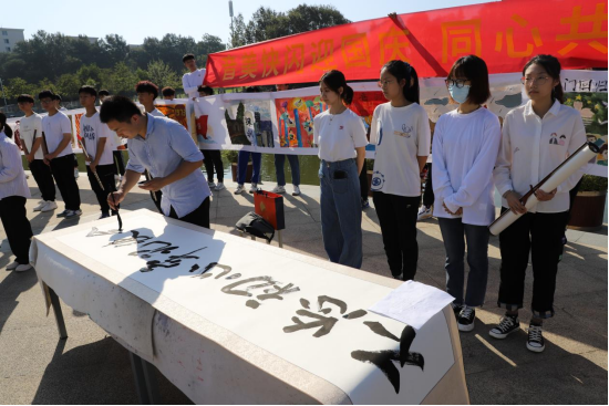 书法教师张峰蘸墨挥毫,借笔传情,以酣畅淋漓的动作创作了四副书法作品,体现了当代青年“强国一代 奋斗有我”的担当。音乐与舞蹈公司带来的歌曲《唱支山歌给党听》抒发了当代老员工的爱国情、报国志。最后,全体合唱《我和我的祖国》将本次活动推向高潮。活动吸引了大批行人纷纷立足观看,拍照留念,现场一片火热。