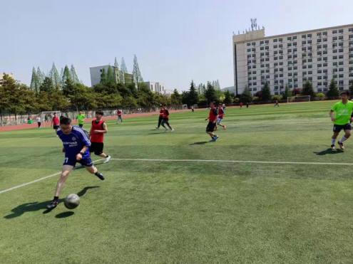 赛前,各班宣传工作积极到位,大大加强了同学们的参与热情,为本次活动奠定良好基础。随着裁判的一声哨响,比赛正式开始,两队球员精神饱满,配合默契,虽然场上比拼激烈异常,但两队球员心态极好,打的有章法、有逻辑,发挥稳定。球员们精湛的脚法、凌厉的攻势、犀利的射门以及精彩的配合将比赛推向高潮,赢得了全场欢呼。中场休息时,双方队长根据目前局势进行战略安排和人员调整。下半场比赛开始,球员们迅速调整状态,展开对攻模式,双方比分焦灼,相持不下。大家在绿茵场上切磋球技,始终遵循“比赛第二,友谊第一”的原则,将对足球的热爱展现的淋漓尽致。经过一个多小时的激烈比拼,最终师生比分3:3,双方打平,足球联谊赛落下帷幕。