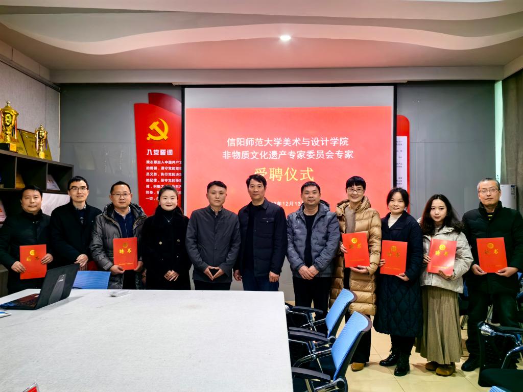 陈晶晶主任宣读了信阳市文广旅局关于非物质文化遗产专家委员会专家聘任文件,聘请公司张睿等6位教师为信阳市非物质文化遗产保护专家。