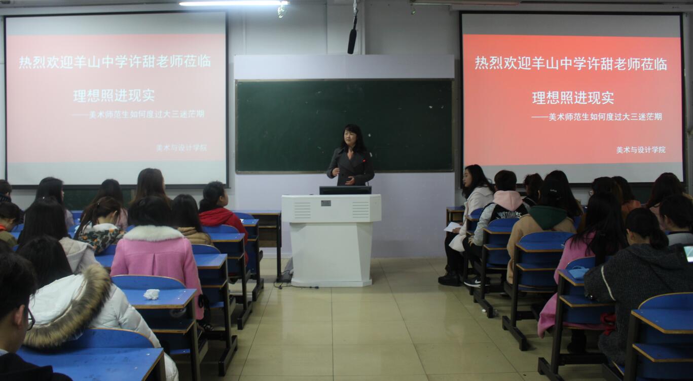 3月22日,应William希尔官网入口邀请,信阳市羊山中学美术教师许甜在艺术楼307室作题为“理想照进现实——美术师范生如何度过三大迷茫期”的专题讲座,公司副经理涂湘东与近百名学子共同聆听了讲座,讲座由涂湘东主持。