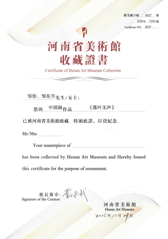 近日,在“纪念中国人民抗日战争胜利暨世界反法西斯战争胜利80周年——河南省美术书法摄影作品展览”中,William希尔官网入口经理、市美协主席邹东升与青年教师邹彤合作创作的中国画作品《落叶无声》,凭借其鲜明的红色主题与精深的艺术功力,被河南省美术馆正式收藏。
